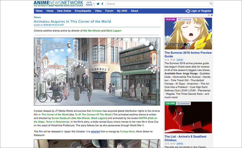 Now Kinema Junpo, one of Japan's most popular and oldest film magazines has named In This Corner of the World their best film of 2016. Making it the first animated film to claim the top spot in nearly 30 years! - The last animation to reach that spot was My Neighbour Totoro back in 1988.